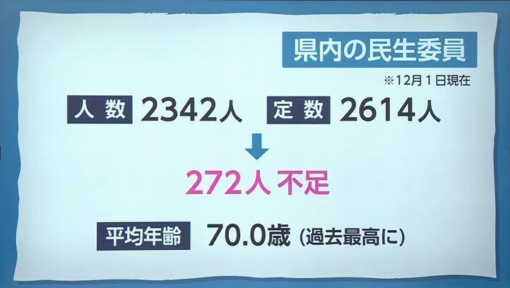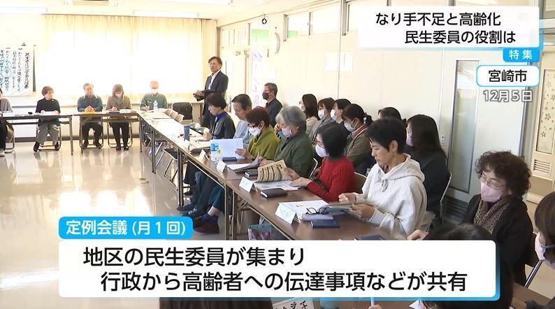 宮崎県によると、26市町村の民生員の定数2614人に対して2342人と、272人が不足している。平均年齢も70.0歳と、過去最高となっている。