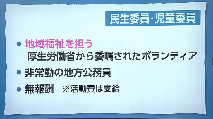 民生委員・児童委員は法律に基づき地域住民が安心して生活できるよう地域福祉を担う、厚生労働省から委嘱されたボランティアだ。非常勤の地方公務員で、無報酬だが活動費が支給され、3年の任期で活動する。
