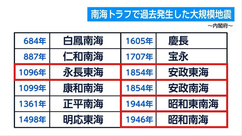 白鳳南海(684年)、仁和南海(887年)、永長東海(1096年)、康和南(1099年)、正平南海(1361年)、明応東海(1498年)、慶長(1605年)、宝永(1707年)、安政東海(1854年)、安政南海(1854年)、昭和東南海(1944年)、昭和南海(1946年)