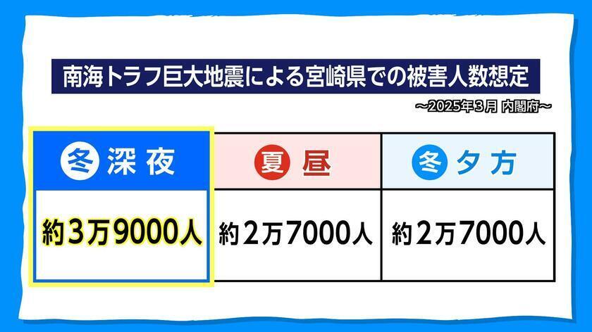 内閣府が2025年3月に公表した「南海トラフ巨大地震による宮崎県での被害人数想定」では、「冬の深夜」に地震が発生した場合、死者数は最大3万9,000人に上るとされる。