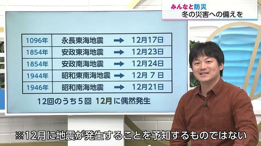 宮崎公立大学 山下裕亮准教授:過去の地震を並べてみると、12月が多くなっていますが、これは「たまたま」なんです。あくまでも「たまたま」なので、12月に地震が起こりますよ、ということを今から言うわけではありません。ですが、これをきっかけに、「冬の地震の備え」について、考えていただきたいと思います。