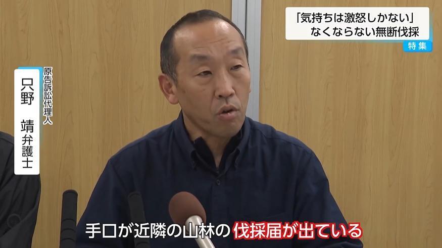 原告側の只野靖弁護士は伐採の手口について「伐採届が出ていないにもかかわらず、許可なく伐採が行われている。手口としては、近隣の山林の伐採届が出ている」と話す。