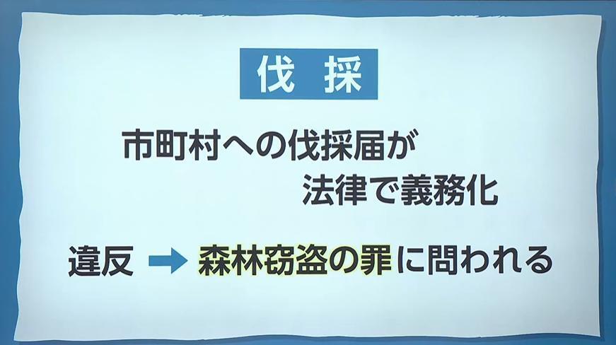 山林で木を伐採する場合は、市町村に伐採届を出すよう法律で義務付けられている。違反すると森林窃盗の罪などに問われる。無断伐採のうち、木を盗む目的で山林の所有者に無断で木を伐採することを「盗伐」という。