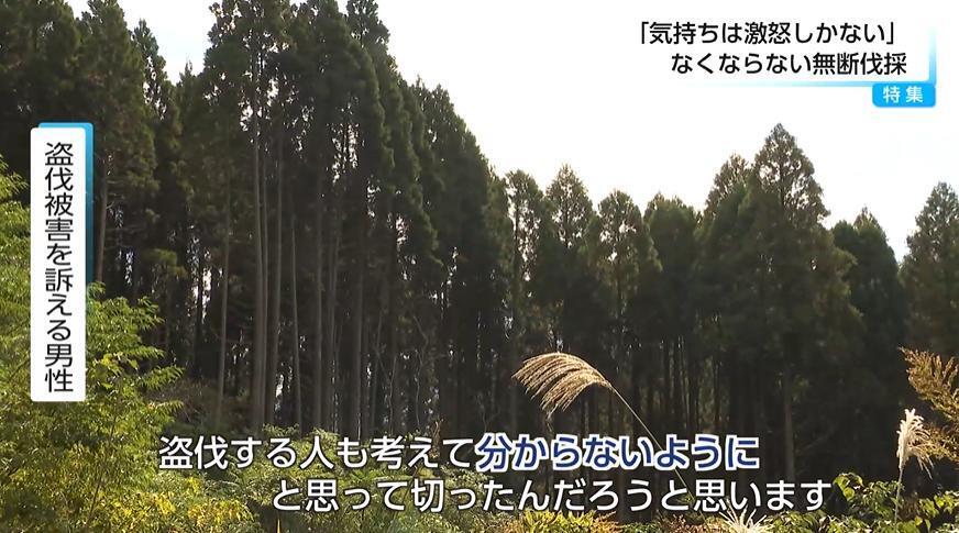 林業の盛んな宮崎県で、山林の無断伐採が後を絶たない。木を盗む目的で伐採する行為は「盗伐」と呼ばれ、森林窃盗罪に問われる可能性もある。被害者にとっては、納得しない形で勝手に木を切られ、罪に問えないことへの怒りがある。一方で、伐採した側は、あくまで「誤って切ってしまった」と主張している。現場を取材した。