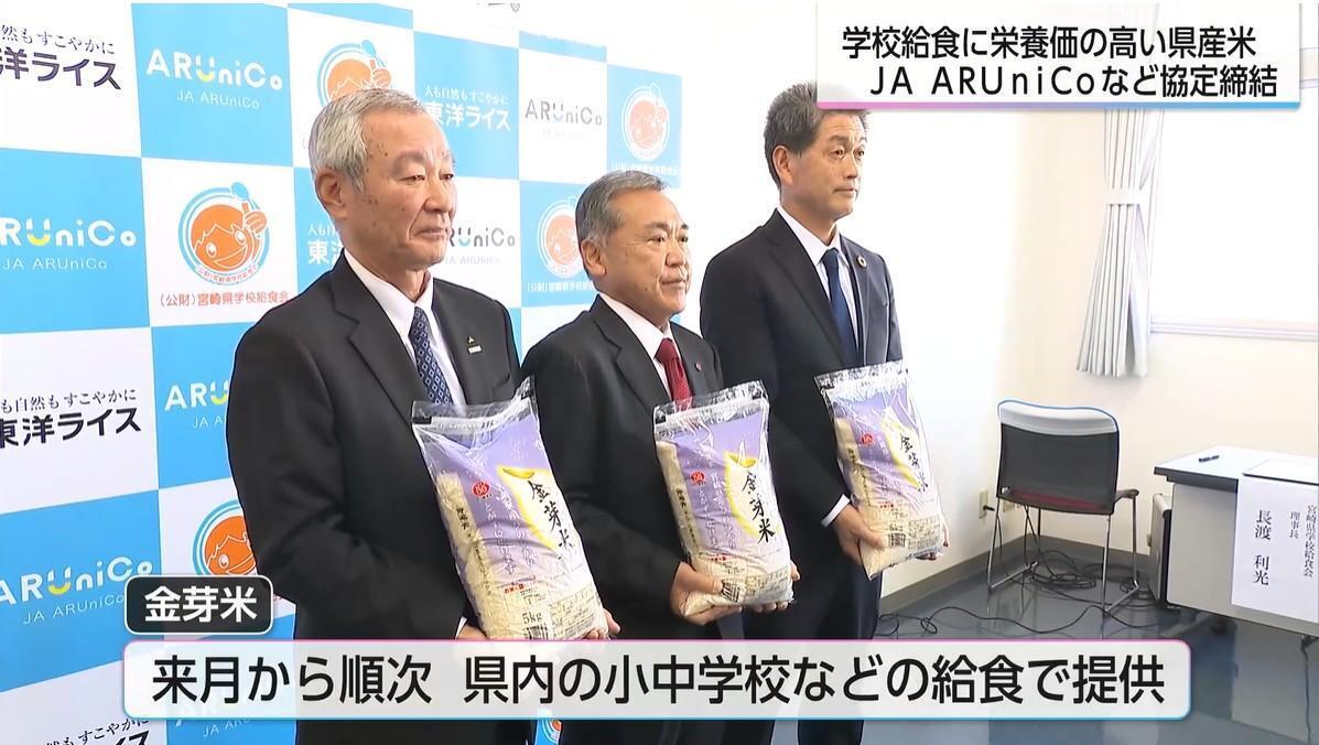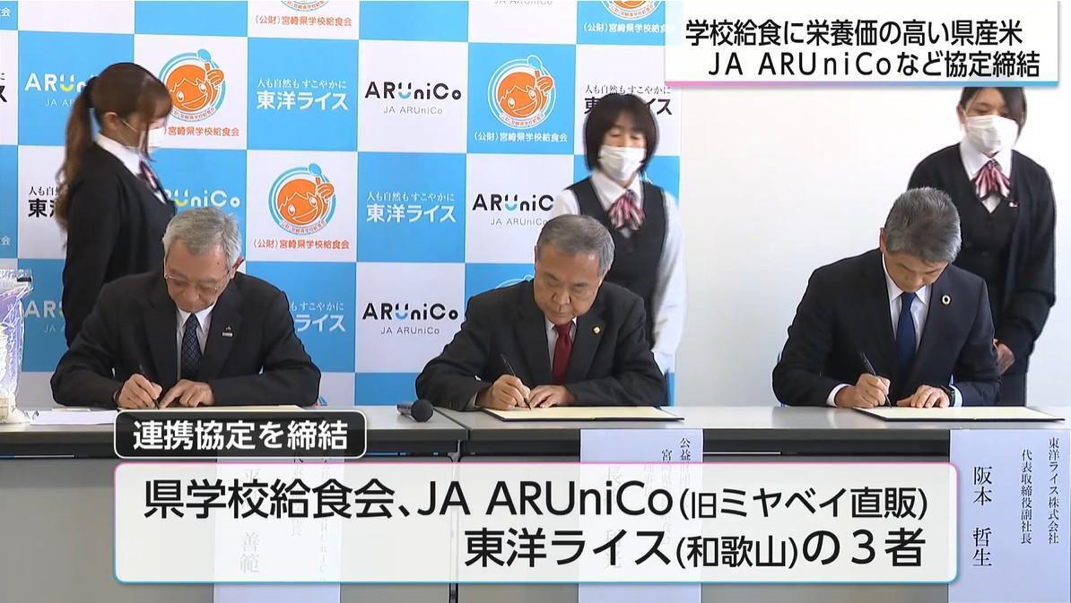 宮崎県学校給食会、米の販売などを手がけるJA ARUniCo(旧ミヤベイ直販)、精米機械メーカーの東洋ライス(和歌山県)の3者が連携協定を締結した。今回の協定は、学校給食での栄養価の高い米の提供を通じた「子どもたちの健康増進」など5項目を柱としている。