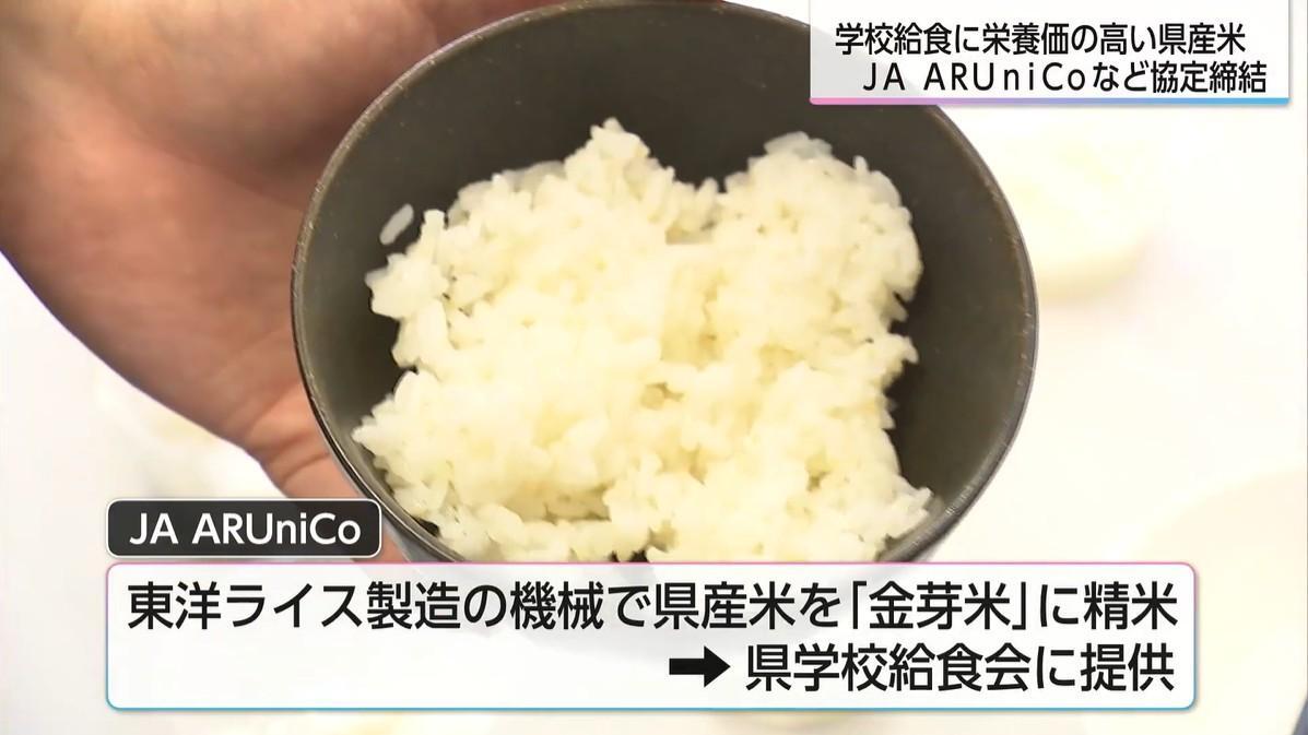 今回の協定締結により、JA ARUniCoは東洋ライス製の精米機械を用いて県産米を「金芽米」に精米し、学校給食へ提供する。
