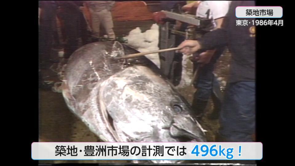 築地・豊洲市場で歴代1位"496kg巨大マグロ"の貴重な記録映像 乗組員6人が3時間かけ捕獲・備え付けのクレーンで水揚げできず大型クレーンをチャーター