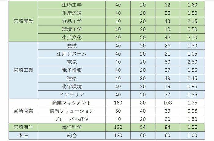 宮崎農業・食品工学2.15倍、生活文化2.10倍。宮崎工業・電気2.50倍、建築2.45倍。宮崎商業・商業マネジメント1.35倍、グローバル経済1.50倍。