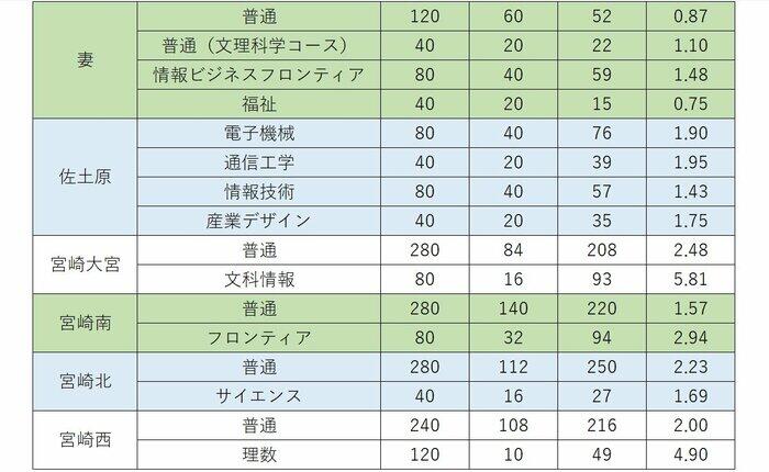 宮崎市普通科4校は、宮崎大宮2.48倍、宮崎南1.57倍、宮崎北2.23倍、宮崎西2.00倍。宮崎大宮・文科情報5.81倍。宮崎南・フロンティア2.94倍。宮崎北・サイエンス1.69倍。宮崎西・理数4.90倍。