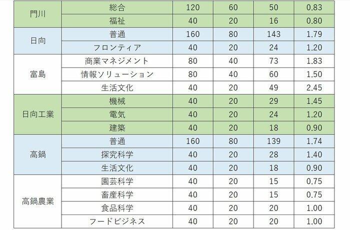 日向・普通1.79倍、フロンティア1.20倍。富島・商業マネジメント1.83倍、生活文化2.45倍。高鍋・普通1.74倍。