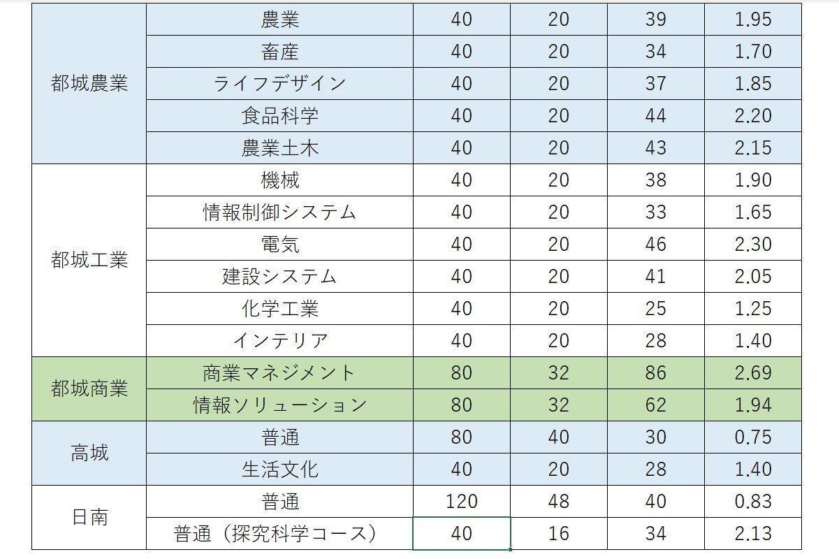 都城農業・食品科学2.20倍、農業土木2.15倍。都城工業・電気2.30倍、建設システム2.05倍。都城商業・商業マネジメント2.69倍、情報ソリューション1.94倍。日南・普通(探究科学コース)2.13倍。
