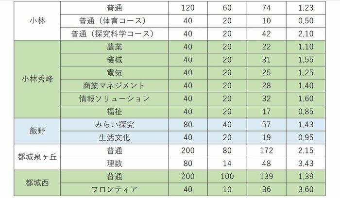 小林・普通(探究科学コース)2.10倍。飯野・みらい探究1.43倍。都城泉ヶ丘・普通2.15倍、理数3.43倍。都城西・普通1.39倍、フロンティア3.60倍。