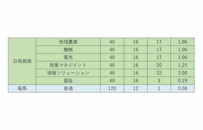 延岡・普通は3.55倍、メディカル・サイエンスは3.60倍と3倍を超えている。延岡工業・機械2.35倍、電気電子2.40倍、土木2.90倍、生活文化2.45倍。