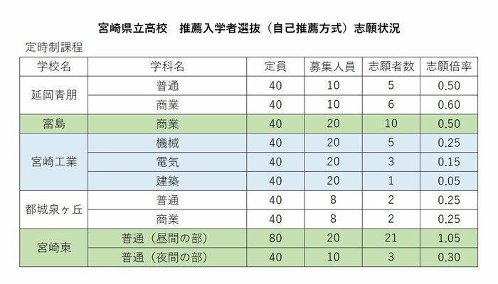 定時制課程、延岡青朋・富島・宮崎工業・都城泉ヶ丘・宮崎東の志願状況