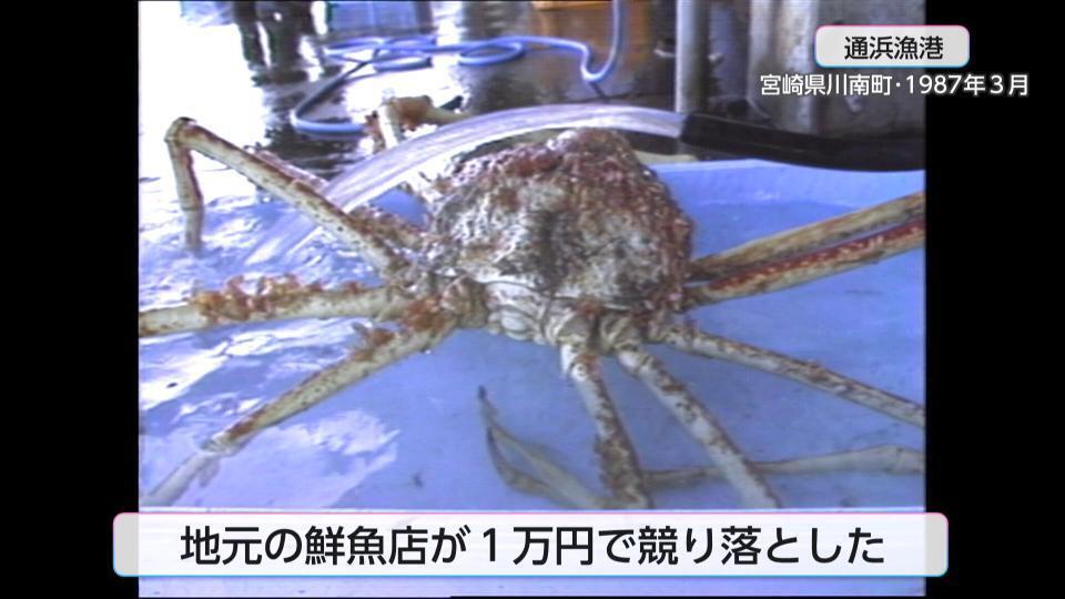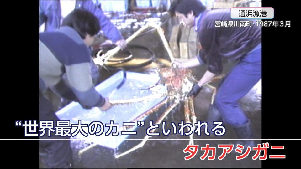 今から約40年前の1987年、宮崎県川南町の通浜(とおりはま)漁港に、脚を広げると3メートルにもなる巨大なカニが水揚げされた。世界最大のカニと言われる「タカアシガニ」で、川南町沖の日向灘で釣り上げられたもの。大物の出現に、港は驚きと活気に包まれた。テレビ宮崎のアーカイブ映像で、当時の様子をお伝えする。