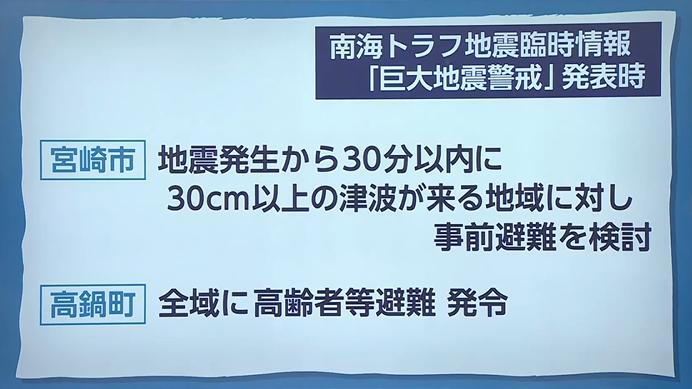 宮崎市は、地震発生から30分以内に30cm以上の津波が到達する地域に対し、事前避難の呼びかけを検討。高鍋町では全域を対象に「高齢者等事前避難」を呼びかける方針だ。