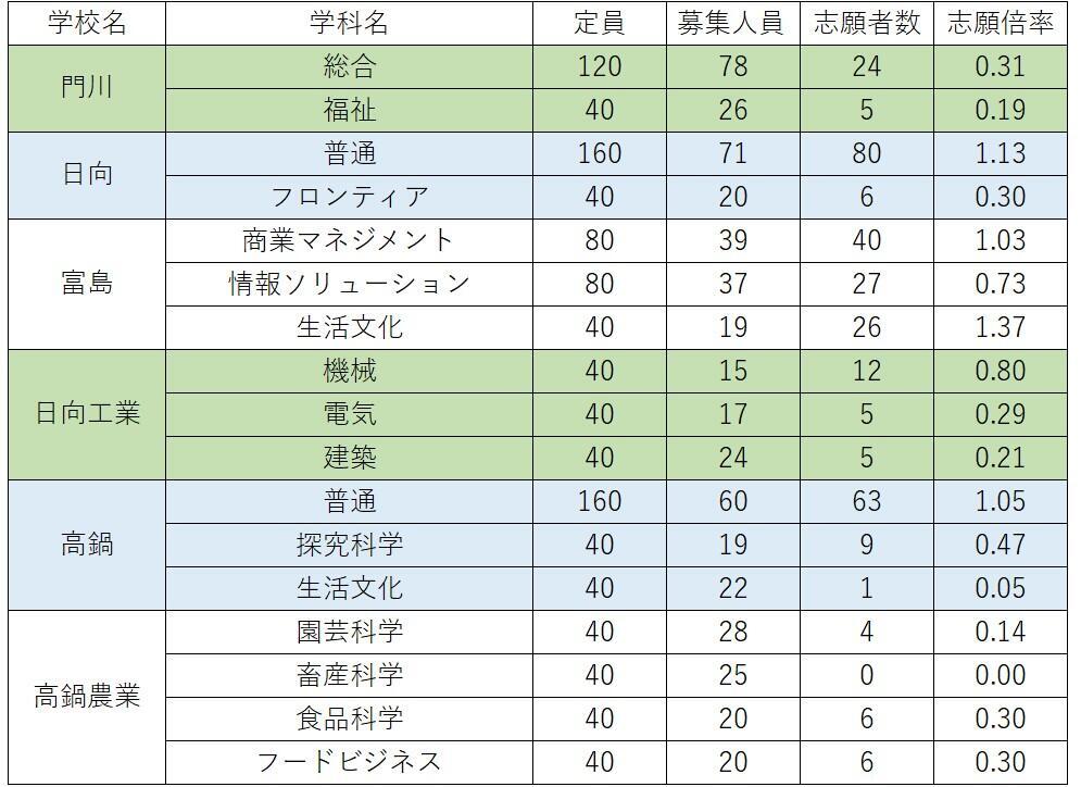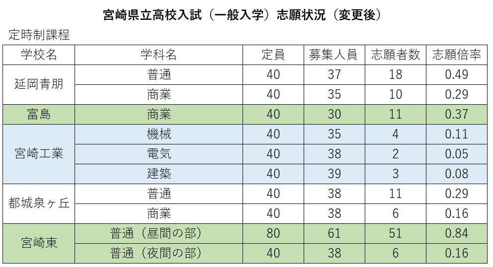 延岡青朋の普通科が0.49倍、宮崎東の普通科(昼間の部)が0.84倍などとなっている。