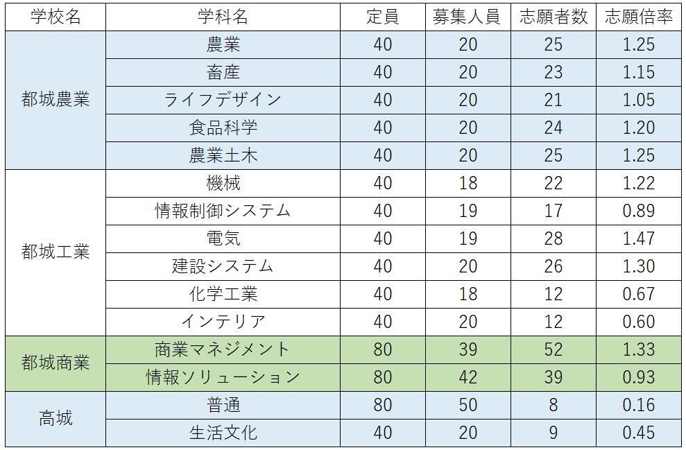 都城農業は農業科が1.25倍、畜産科が1.15倍、食品科学科が1.20倍、農業土木科が1.25倍。都城工業は機械科が1.22倍、電気科が1.47倍、建設システム科が1.30倍。都城商業の商業マネジメント科は1.33倍と高くなっている。