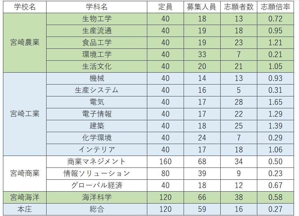 宮崎農業は食品工学科が1.21倍。生活文化科が1.05倍。宮崎工業は電気科が1.65倍、電子情報科が1.29倍、建築科が1.39倍と、いずれも高い倍率。
