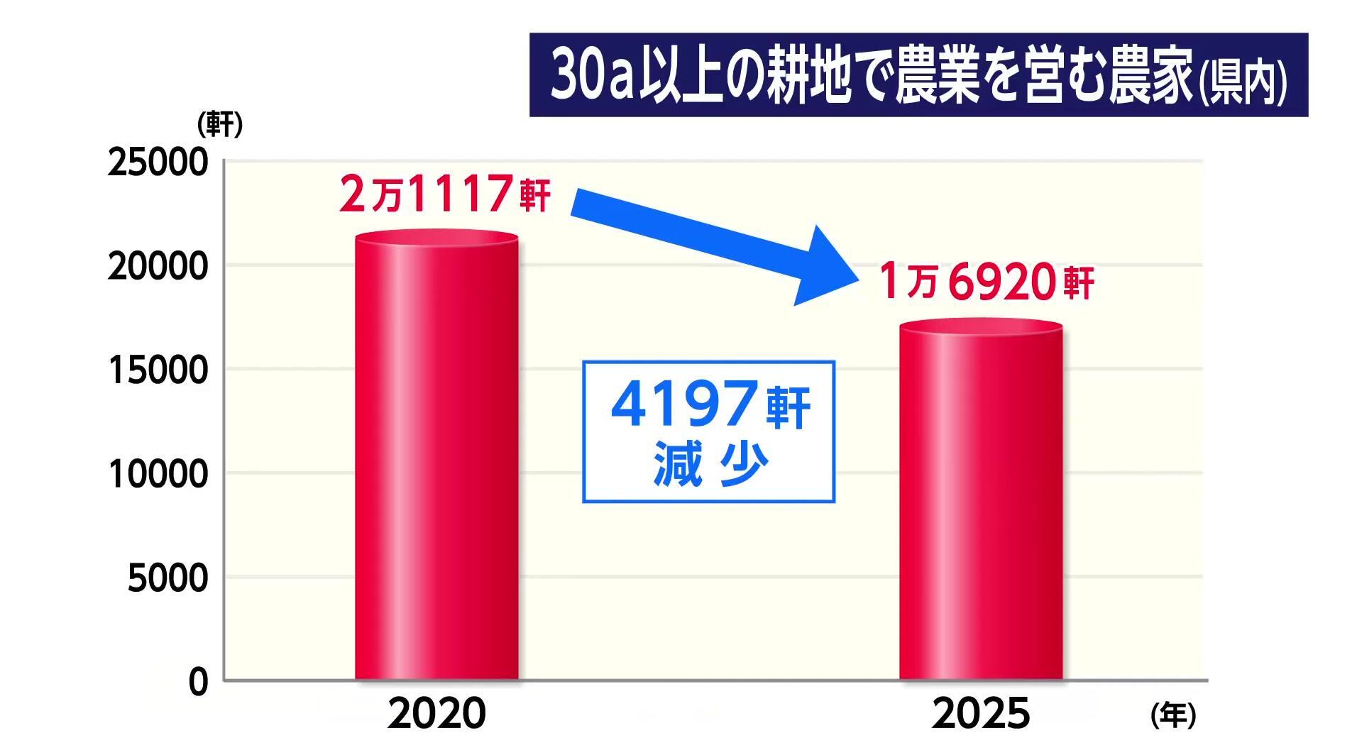 県によると、2025年2月時点で30 a以上の耕地で農業を営む農家の数は1万6920軒で、5年前と比べて4197軒も減っている。