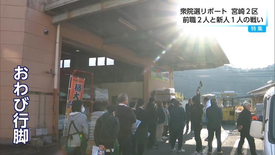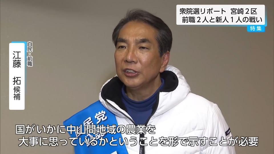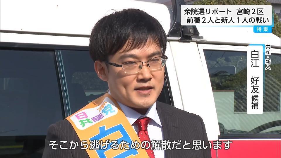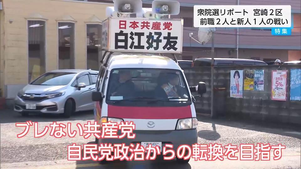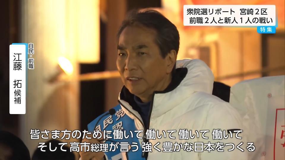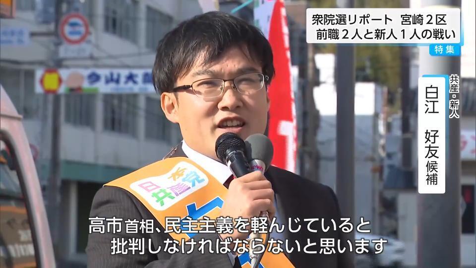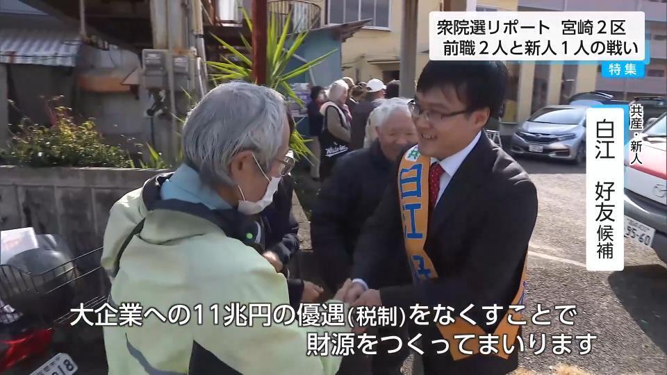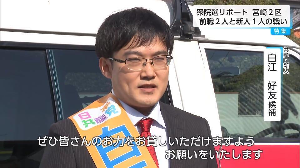 衆議院選挙の宮崎2区には、届け出順に共産党・新人の白江好友(しらえ・よしとも)候補、9期目を目指す自民党・前職の江藤拓(えとう・たく)候補、国民民主党・九州比例区の前職、長友慎治(ながとも・しんじ)候補の計3人が立候補している。