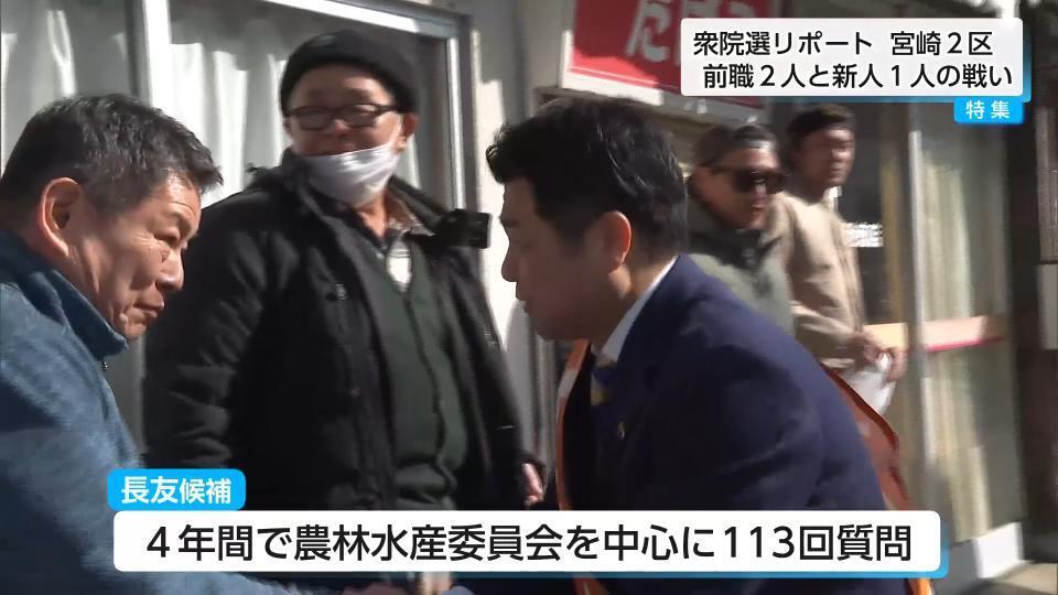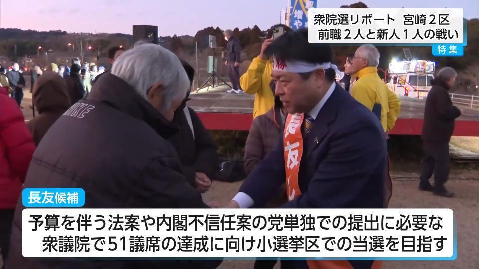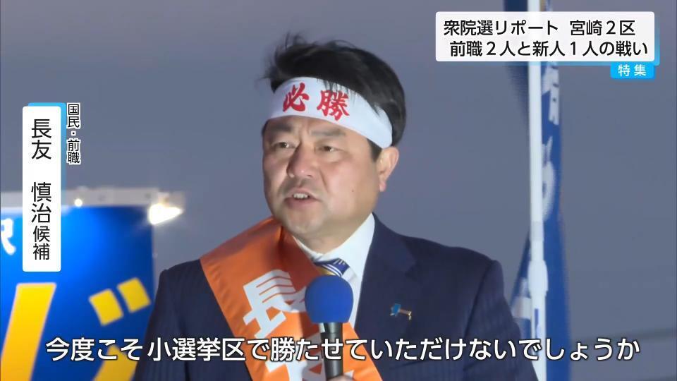 異例の短期決戦となった衆院選も終盤を迎えている。宮崎2区では前職2人が激しく争っている。テレビ宮崎が行った情勢調査では、国民民主党の長友慎治候補が先行、自民党の江藤拓候補が追う展開となっていて、それに共産党の白江好友候補が続いている。