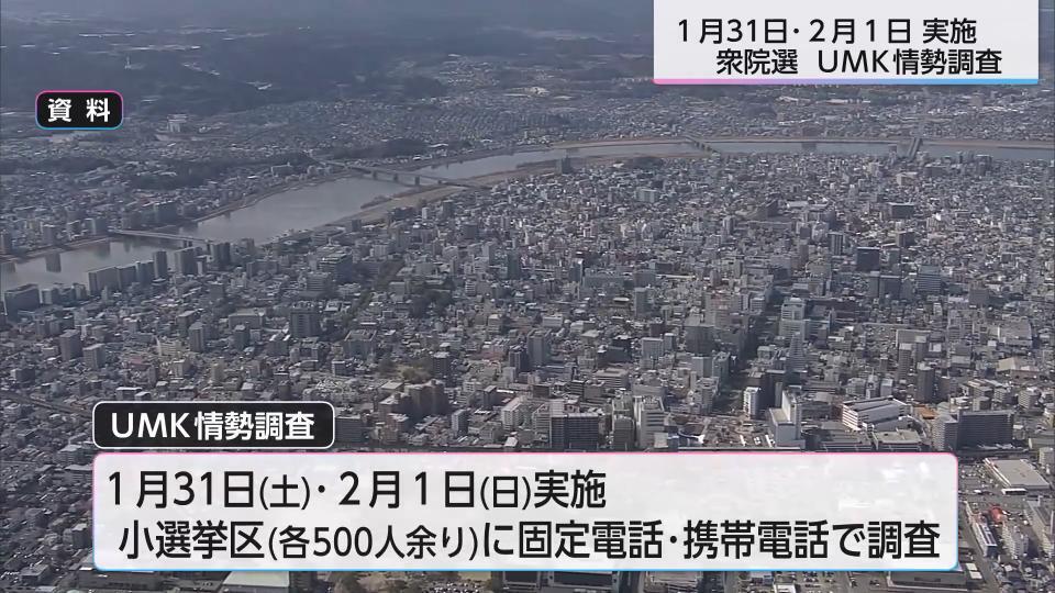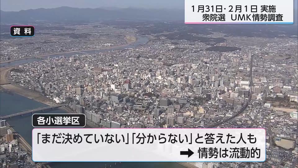 2月8日に投開票が行われる衆議院議員選挙について、UMKは宮崎県内3つの小選挙区の中盤の情勢を調査しました。宮崎1区は中道の前職を自民の元職が追い、2区は国民の前職が先行、3区は自民の前職が優位に立っています。