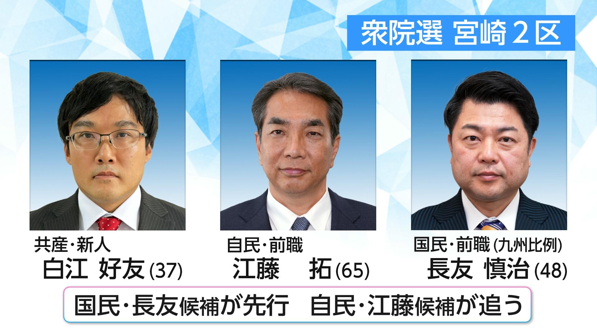 宮崎2区は、国民民主党の長友慎治候補が先行、自由民主党の江藤拓候補が追う展開となっていて、それに日本共産党の白江好友候補が続いています。