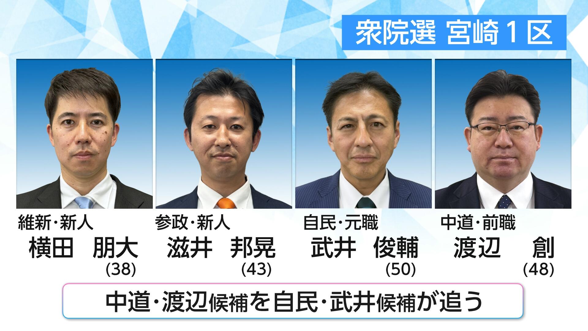 宮崎1区は、中道改革連合の渡辺創候補を自由民主党の武井俊輔候補が追い、日本維新の会の横田朋大候補、参政党の滋井邦晃候補がそれに続く展開となっています。
