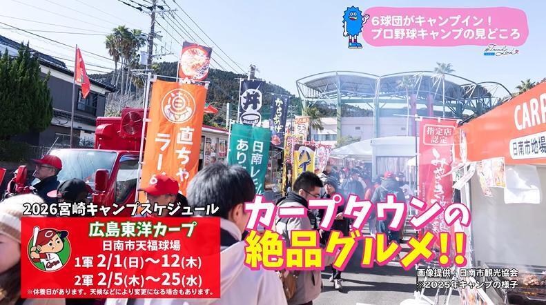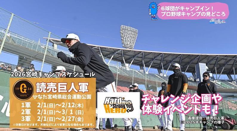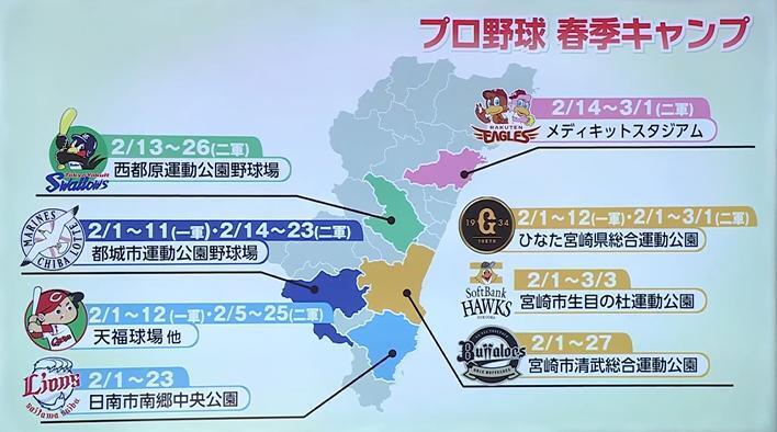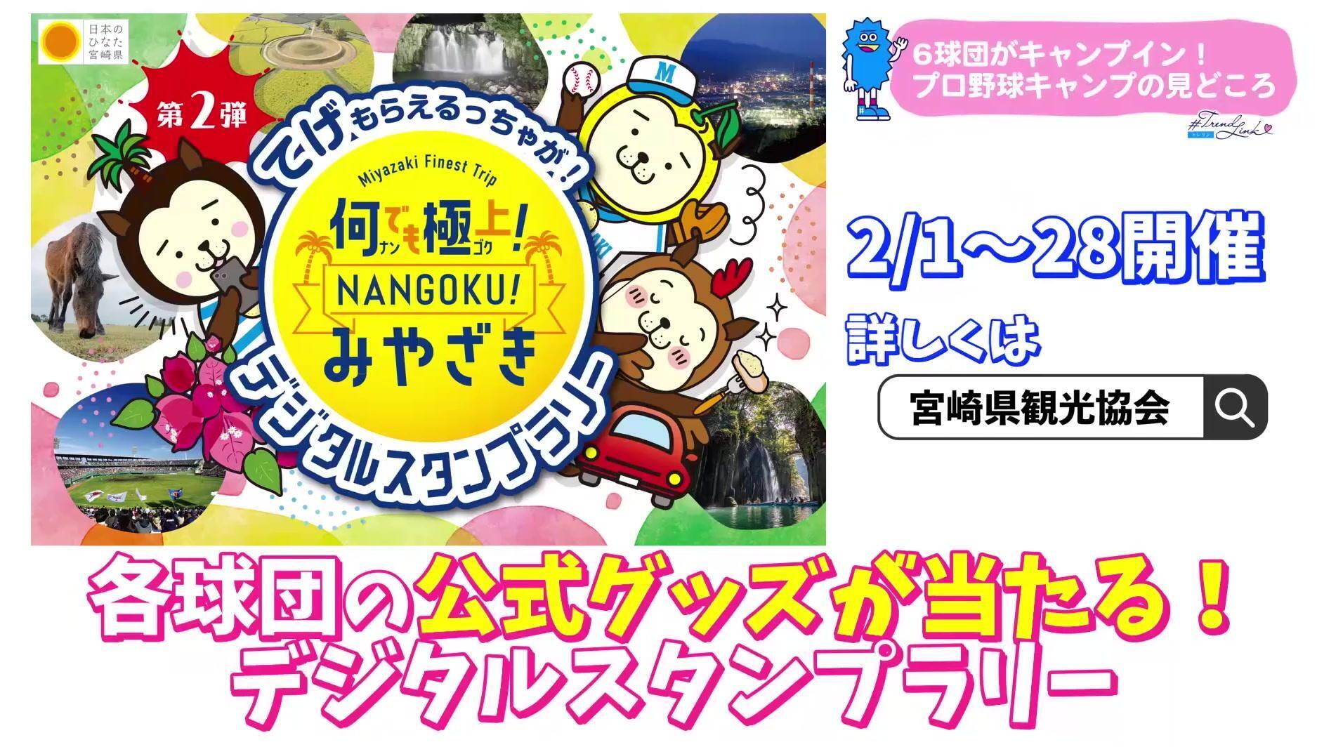 さらに、キャンプ地と県内観光地を巡り各球団の公式グッズが当たるデジタルスタンプラリーも実施される。キャンプの詳細は各球団のホームページや、宮崎県、各市の観光協会ホームページで確認を。