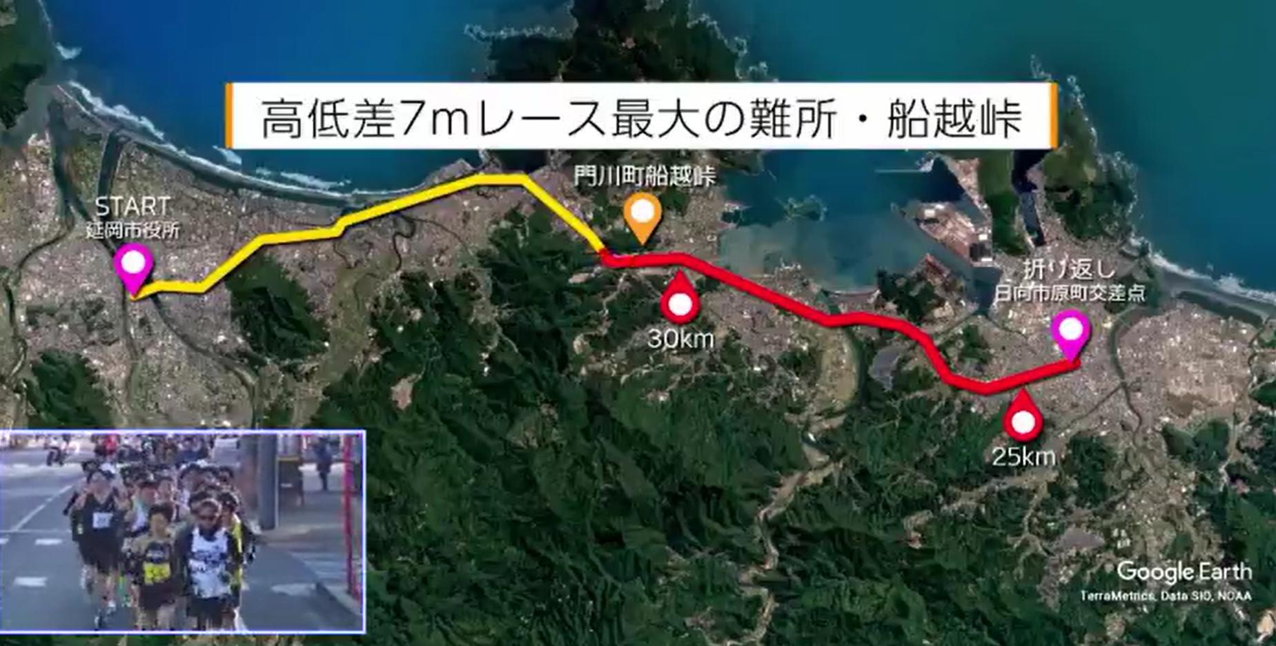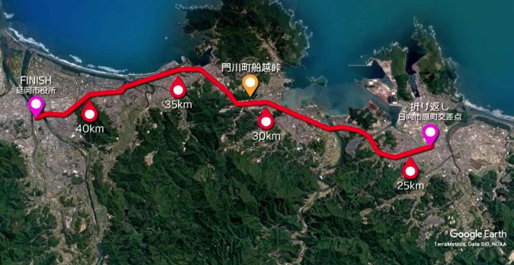 スタート/フィニッシュは、宮崎県北部の工業都市、延岡市。延岡市役所前をスタートしたランナーは、市街地を南下し、東九州の大動脈、国道10号線に合流。魚の町、門川町に入ると15キロポイント。ランナーたちはさらに南下し、折り返しは日向市の中心街、原町交差点。