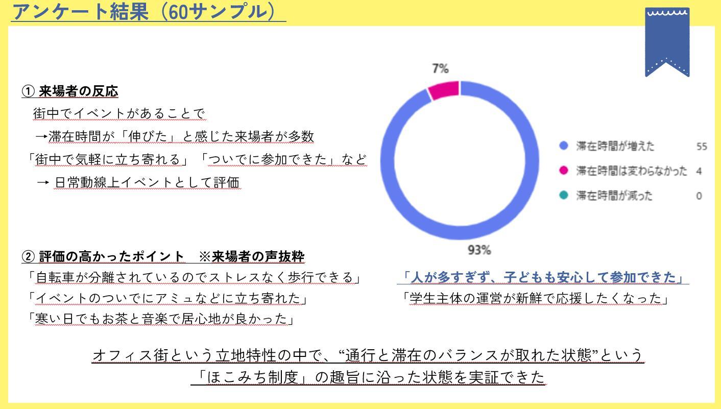 評価が高かったポイントとしては、「自転車が分離されているのでストレスなく歩行できる」「人が多すぎず、子どもも安心して参加できた」「学生主体の運営が新鮮で応援したくなった」「寒い日でもお茶と音楽で居心地が良かった」などが挙げられていた。
