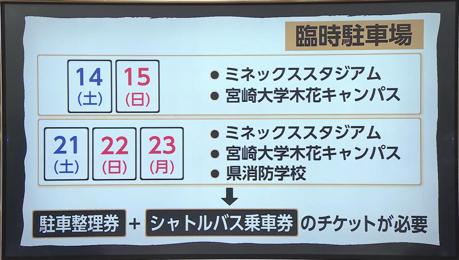 土日祝日は、ミネックススタジアム、宮崎大学木花キャンパス、県消防学校にも臨時駐車場が設けられ、駐車整理券とシャトルバス乗車券がセットになったチケットが販売されている。