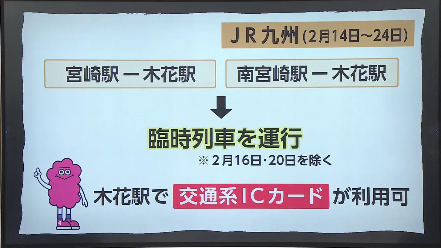 JR九州は、キャンプ期間中、宮崎駅と木花駅、南宮崎駅と木花駅の区間で、臨時列車を運行する。木花駅では交通系ICカードが利用できる。
