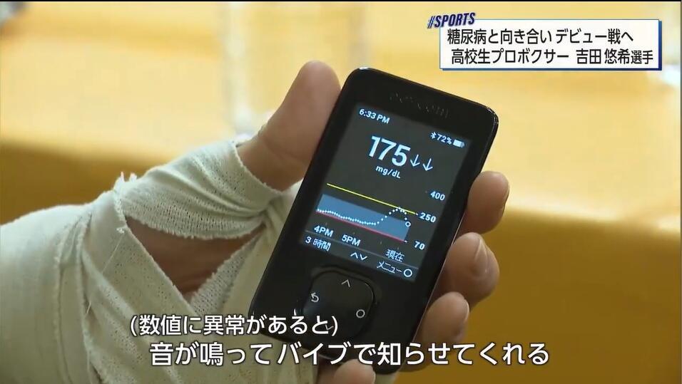 これで血糖値を測っています。腕に付けてここからBluetoothで情報が飛んでいく。(異常があると)音が鳴ってバイブで知らせてくれる。(血糖値が)下がったときは糖分を摂って、血糖値が上がったときはインスリンを打って下げるように対処している。