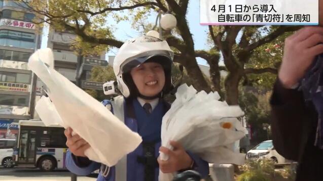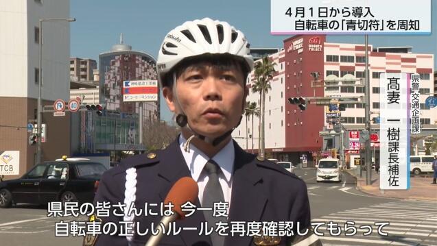 隊員たちはさっそくJR宮崎駅前で、自転車の利用者などにチラシを配り、「青切符」の導入について周知した。女性白バイ隊員は、「4月から自転車の青切符が導入されますので、よろしくお願いします」と、通行している人に呼び掛けた。