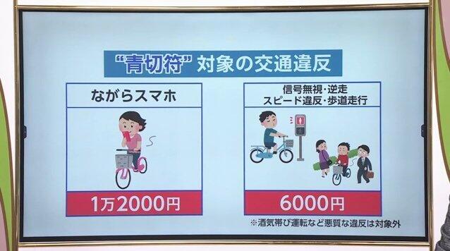 反則金の額は、スマートフォン等を使用しながらの運転、いわゆる"ながらスマホ"が最も高く1万2,000円、信号無視や逆走、歩道走行は6,000円、イヤホン使用や傘さし運転が5,000円などとなっている。違反項目は全部で113項目に及ぶ。