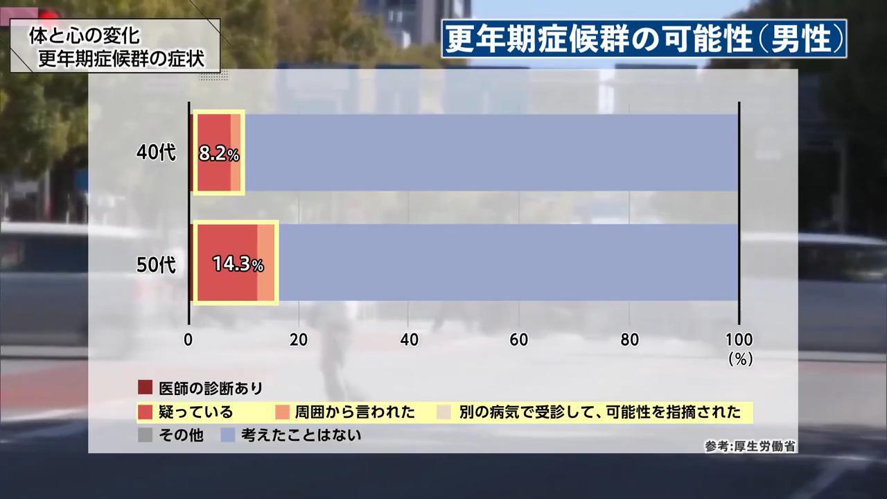 更年期症候群の「可能性があると考えている」男性の割合は40代で8.2%、50代で14.3%と、女性に比べて多くはないものの、一定数の男性にも症状が現れていることが示されている。