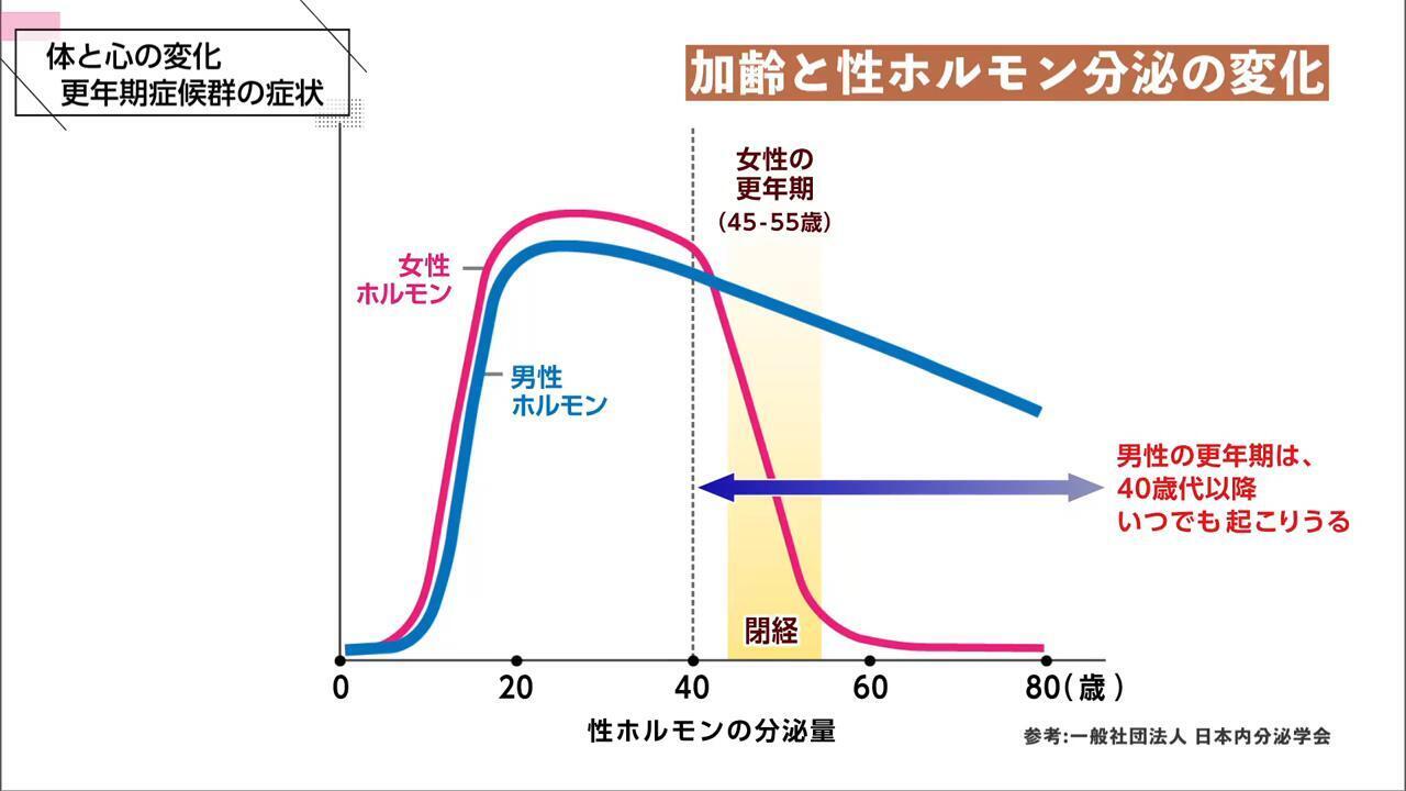 また、男性は40代以降に男性ホルモンが緩やかに減少することで症状が起きやすくなる。減少の速さや度合い、時期には個人差が大きく、どの年代でも起こる可能性があるとされている。