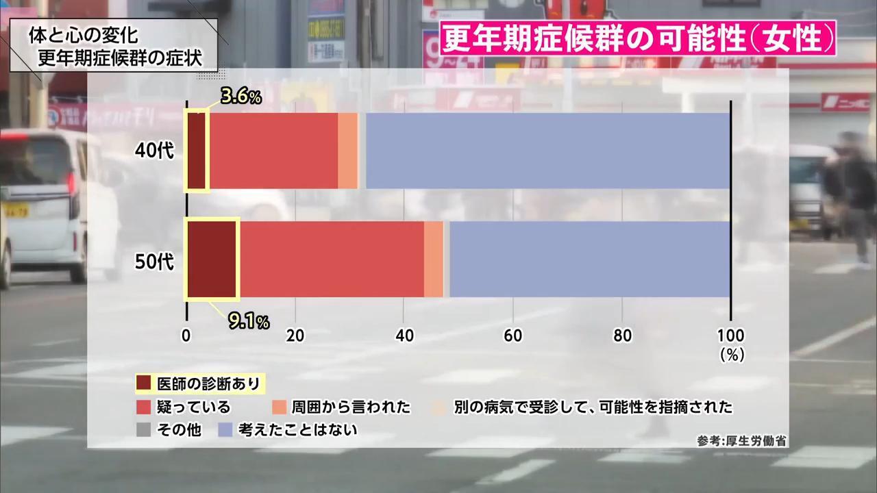 厚生労働省の更年期症状に関する意識調査によると、医療機関で更年期症候群と「医師の診断を受けたことがある」女性の割合は、40代で3.6%、50代で9.1%。
