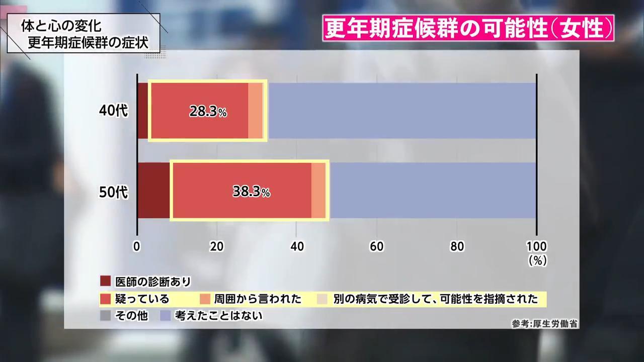更年期症候群の「可能性があると考えている」女性は40代で28.3%、50代で38.3%となっている。