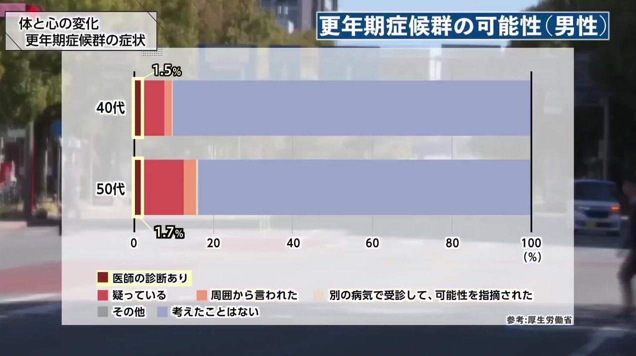 男性で更年期症候群と「医師の診断を受けたことがある」割合は、40代で1.5%、50代で1.7%。