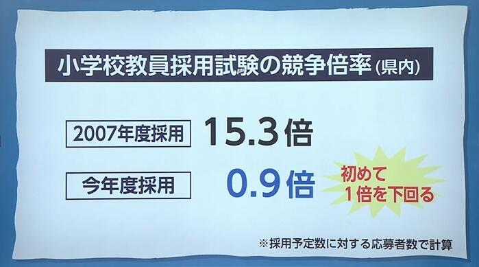 県内の小学校教員採用試験の競争倍率は2007年度採用の15.3倍をピークに減少の一途をたどり、2026年度の採用試験では0.9倍と、初めて1倍を下回る結果となった。教員のなり手不足の深刻化が浮き彫りとなる中、次世代の教育を担う人材の育成が急務となっている。
