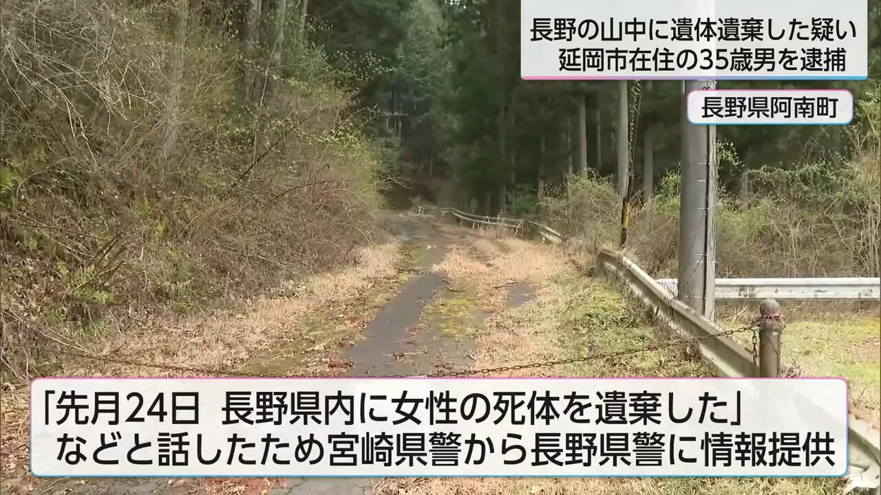 長野県の山中に女性の遺体を遺棄した疑いで、宮崎県延岡市の35歳の男が逮捕された。司法解剖の結果、死因は窒息死と判明し、男の母親であることが判明した。捜査関係者によると、男は「母親を殺害し、車で運んだ」と供述しており、警察は殺人容疑も視野に、犯行の動機や経緯を詳しく調べている。