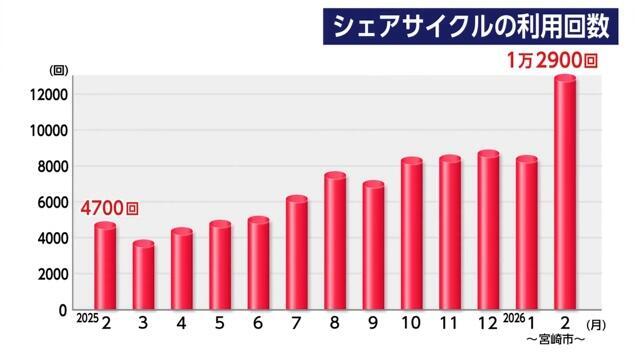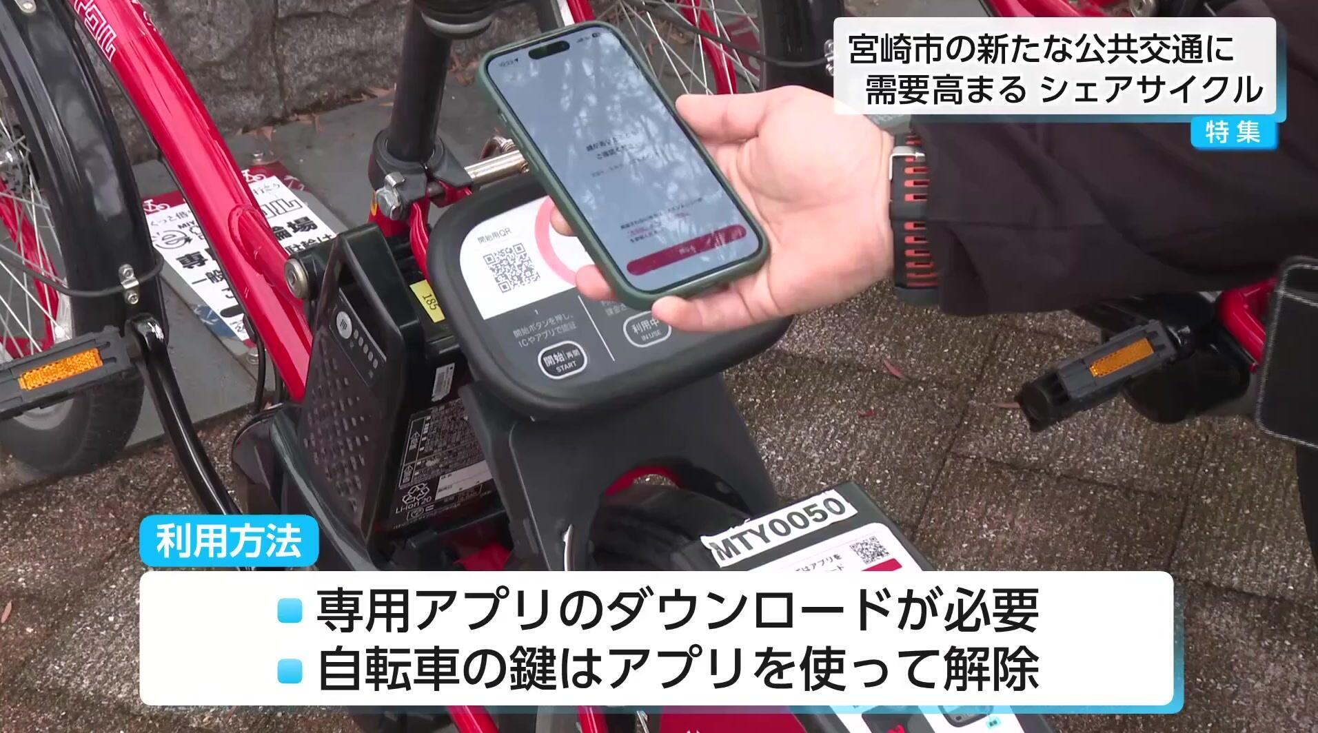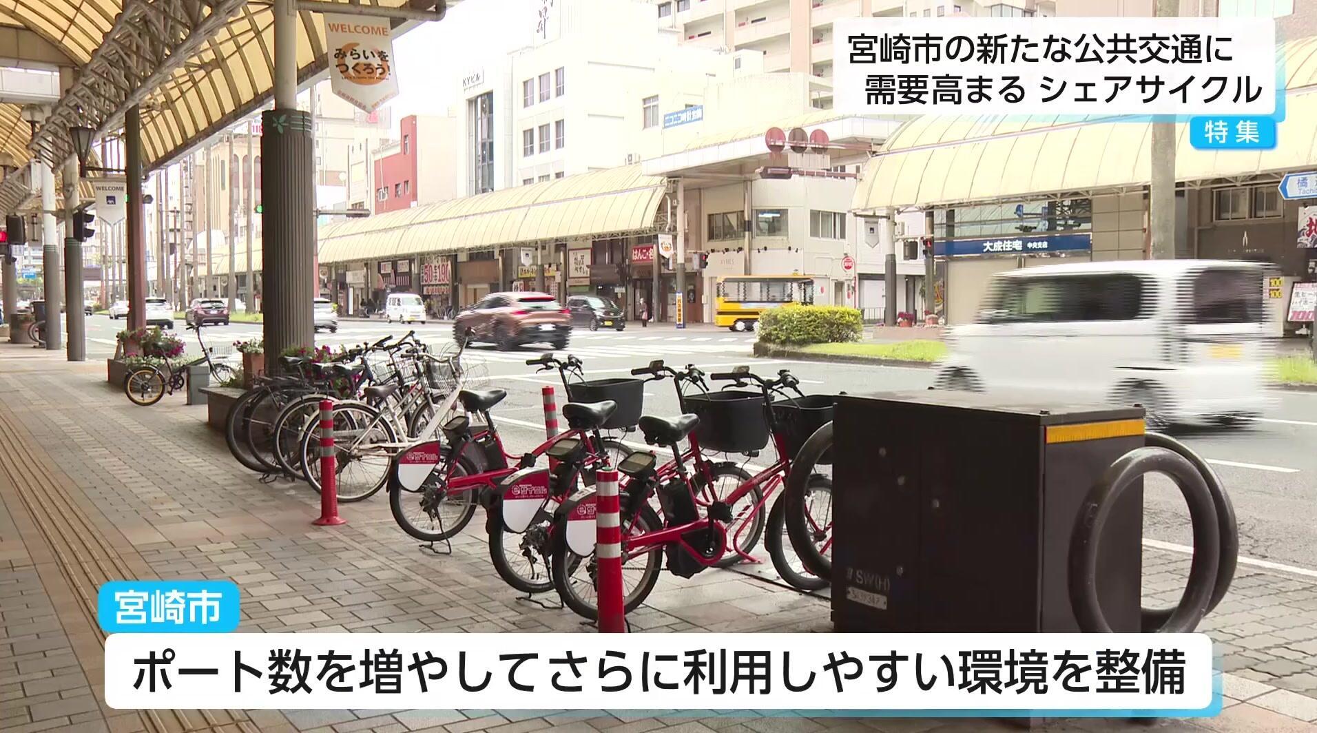 宮崎市内でシェアサイクルの需要が高まっている。市街地を中心に、116ポートに395台の車両が設置され、2024年2月には月間の利用回数が1万回を突破した。温暖で平坦な地形という利点を生かし、通勤や通学、県外からの観光客の移動手段として定着しつつある。