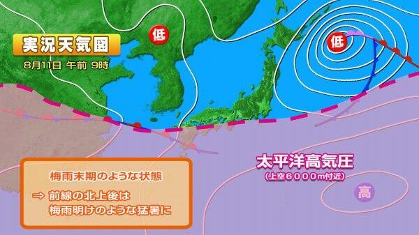 こちらが、先月の長雨の降り始めに当たる、8月11日の天気図です。