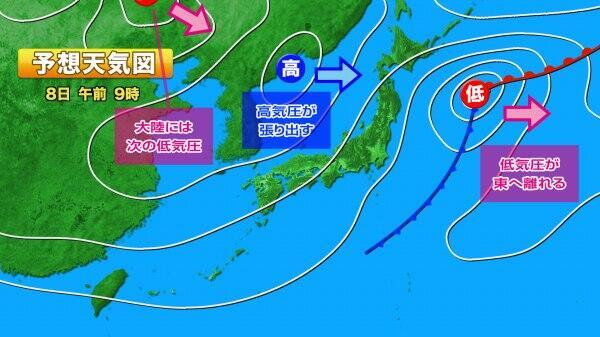 あすの予想天気図では、前線を伴う低気圧が太平洋へと離れ、日本海には高気圧が張り出しています。
