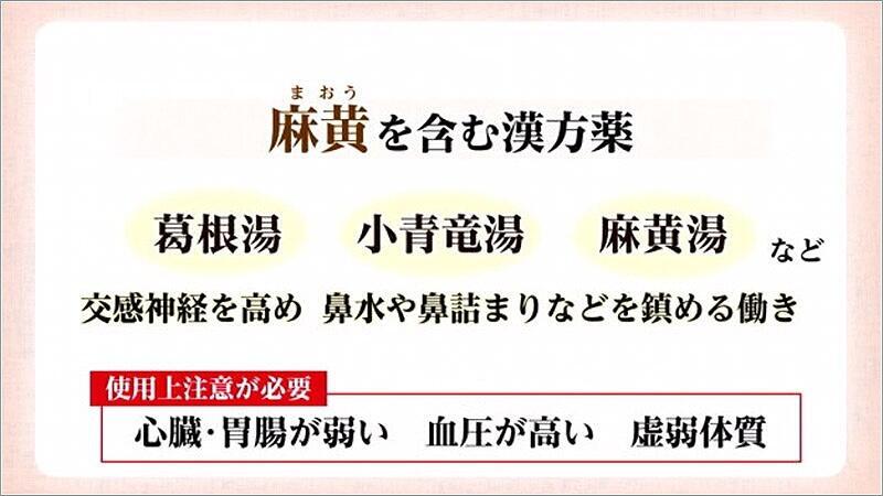 交感神経を高め、鼻水や鼻詰まりを鎮める働きがありますが、効き目が強い分、心臓や胃腸が弱い人、血圧が高い人、虚弱体質の人にはおすすめできません。