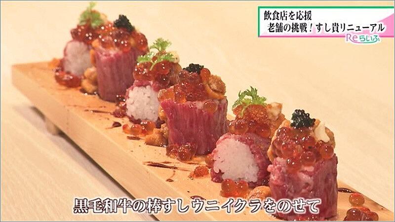 「黒毛和牛の棒すしウニイクラをのせて」。