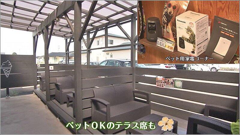 ペット用の家電品コーナーもあり、外にはペットとくつろげるテラス席もあります。